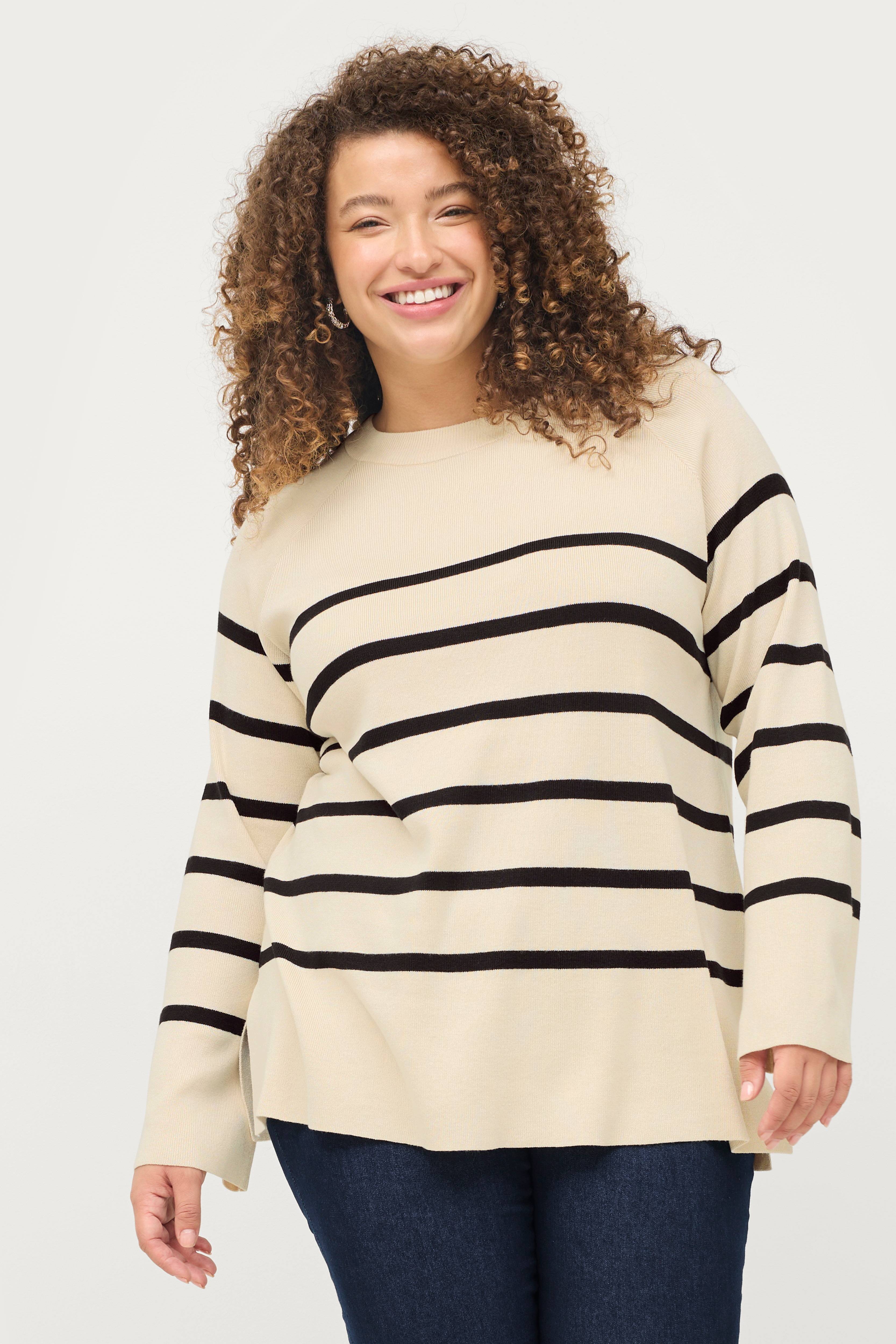 • Uformel model med strikkede striber• Rund hals med ribstrikket kant• Langt, lige raglanærme• Slidser nede i siderne