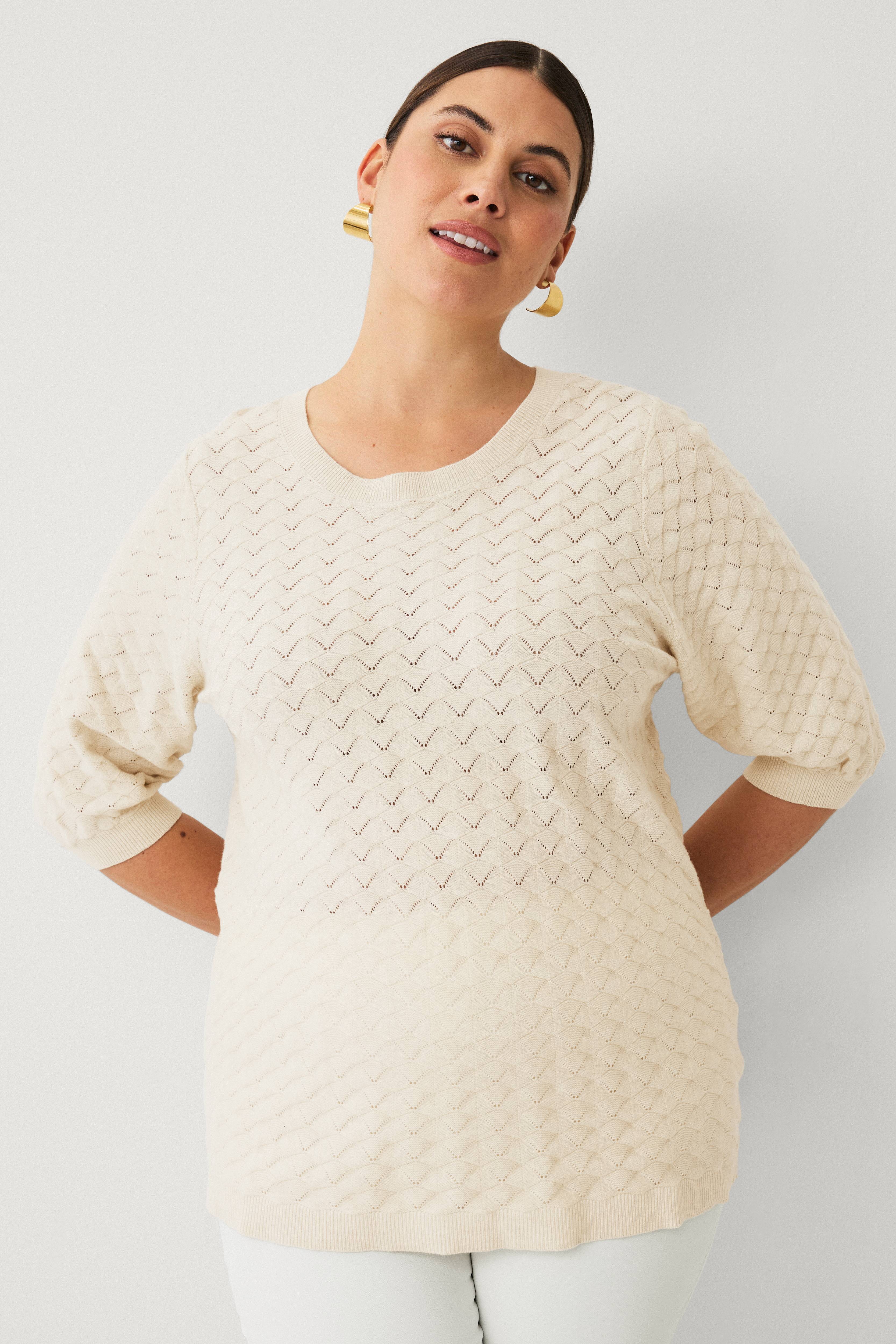 • Strikket trøje med hulmønster• Rund halsudskæring• Halvlange ærmer• Ribstrik ved manchetterne og nederst• Store størrelser