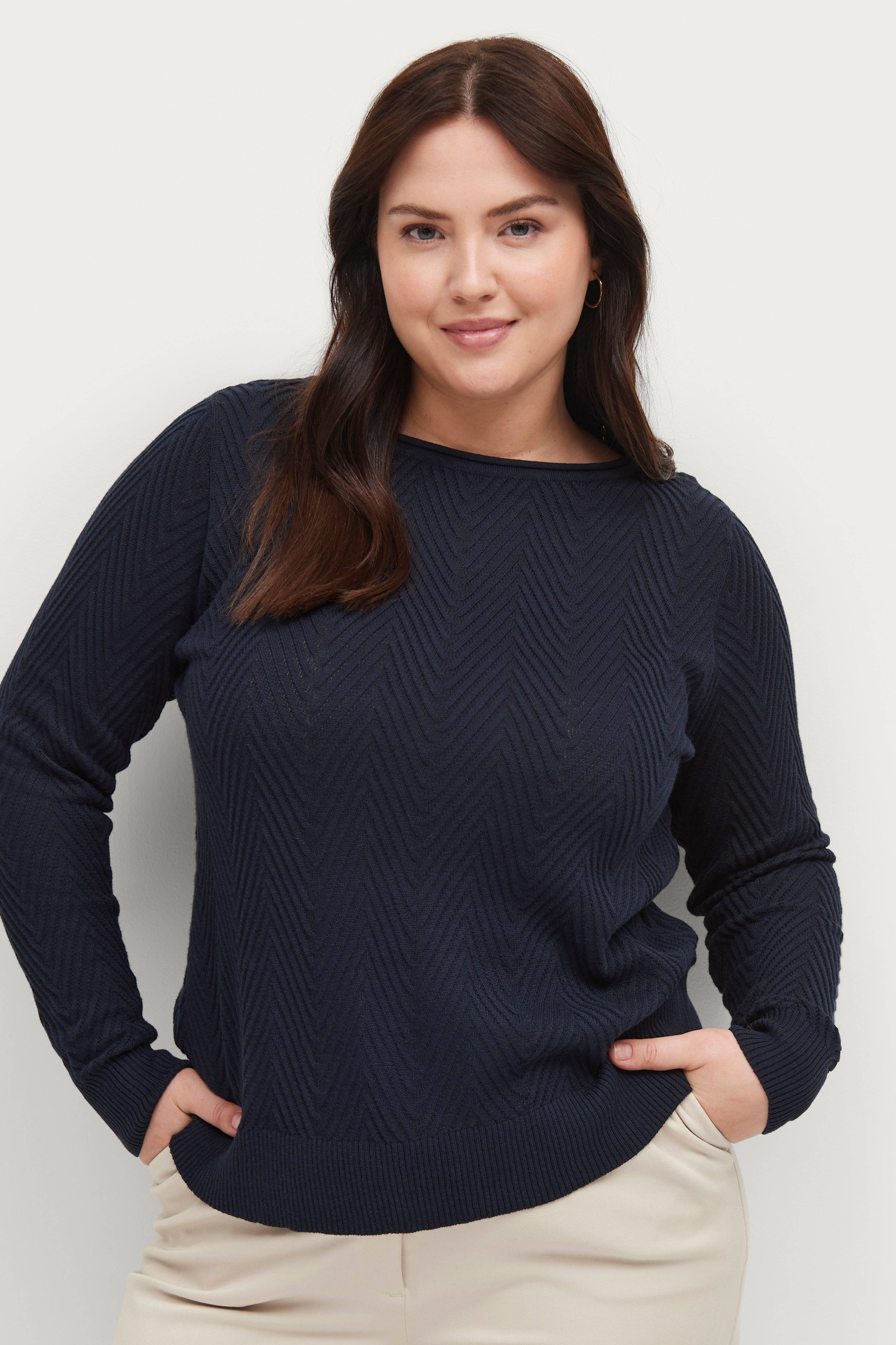 • Strikket trøje med strukturmønster• Rund halsudskæring• Lange ærmer• Ribmanchetter ved manchetterne og nederst