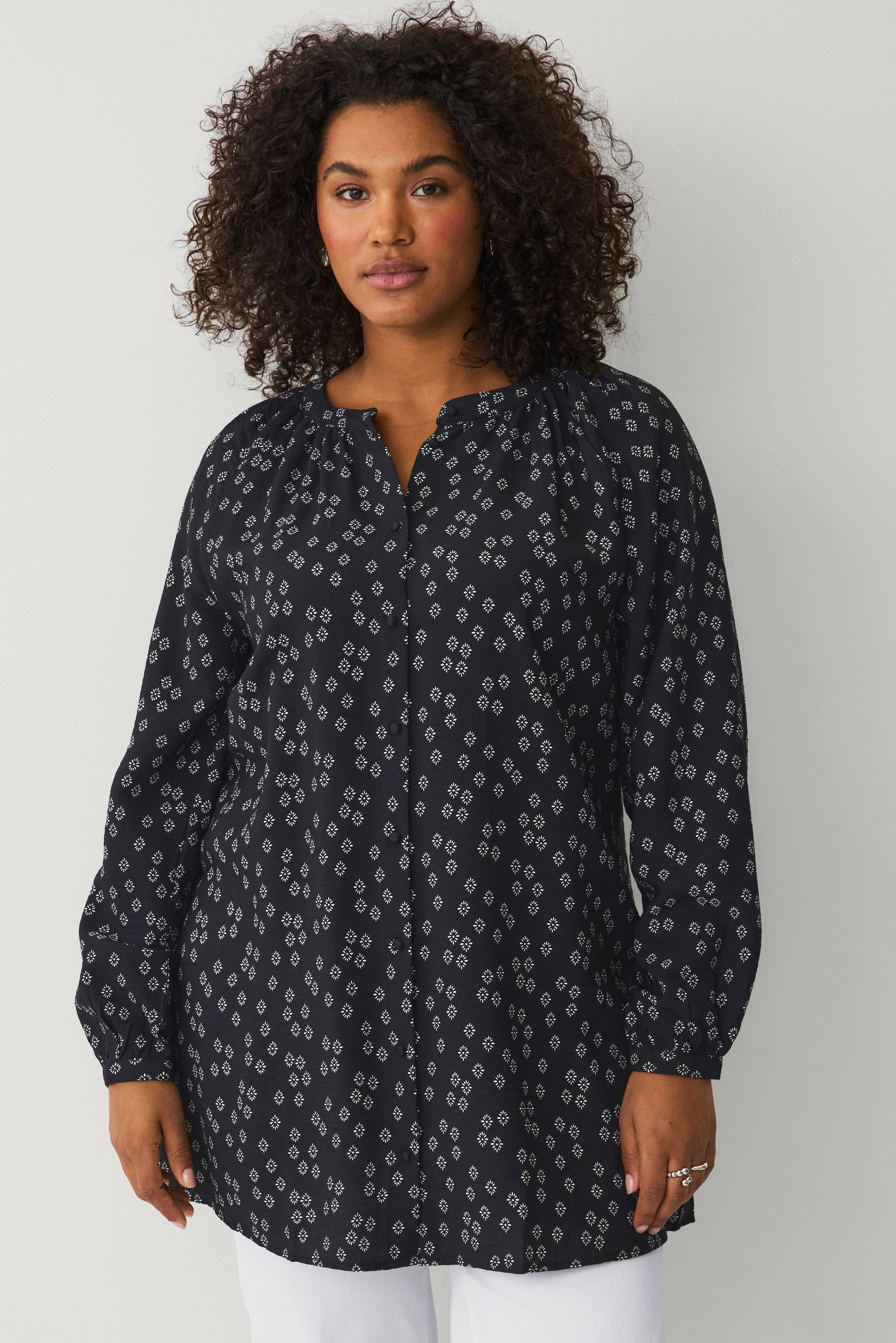 • Model med svaj• Rund hals med lille kant og samling• Knapstolpe med beklædte knapper hele vejen frem• Langt raglanærme med tynd manchet• Længde: 86 cm i størrelse S