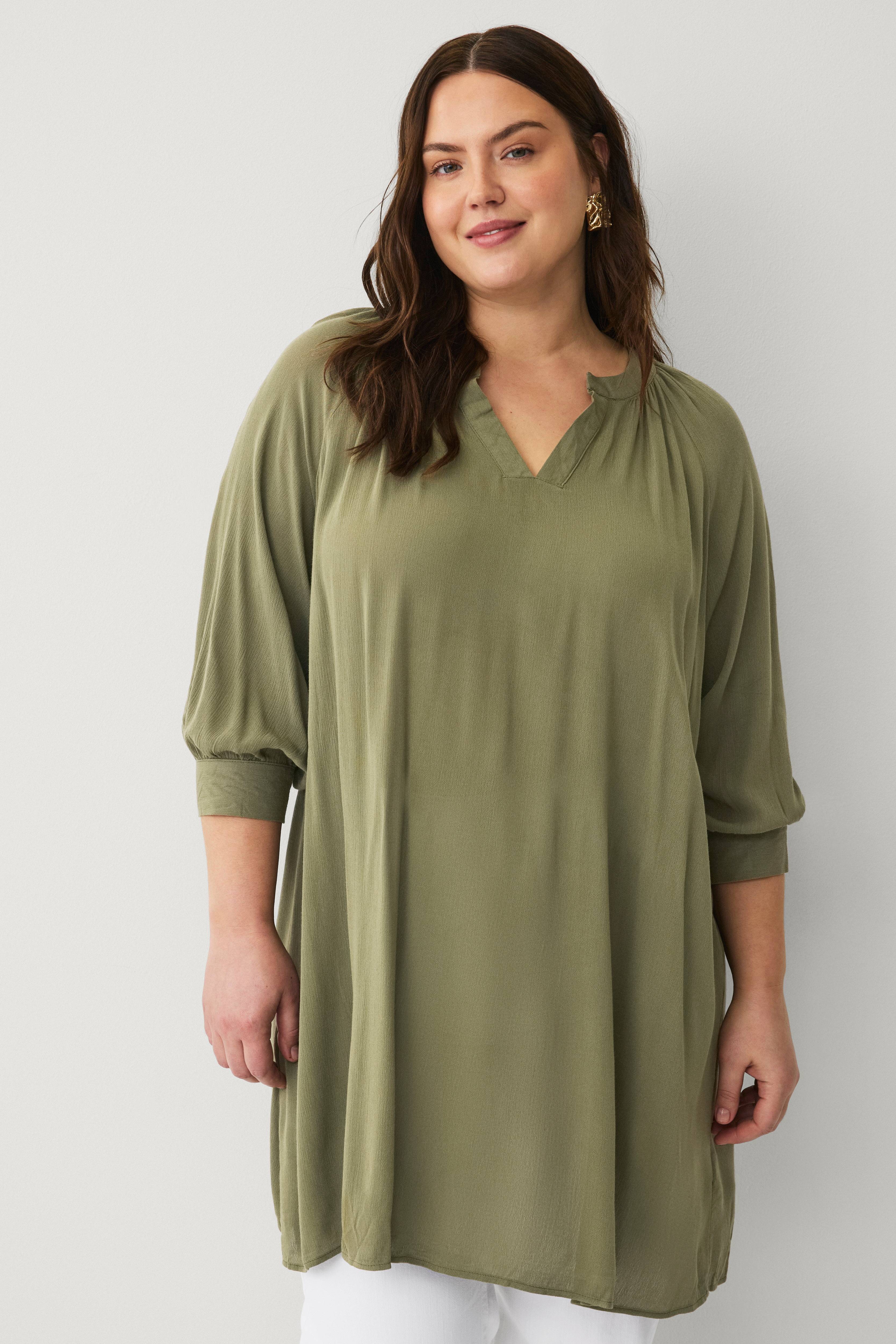 • Store størrelser• Model med svaj i crepe• Rynket halsudskæring med ventilation foran• Langt, bredt ærme i crepe• Længde: 93 cm i størrelse S