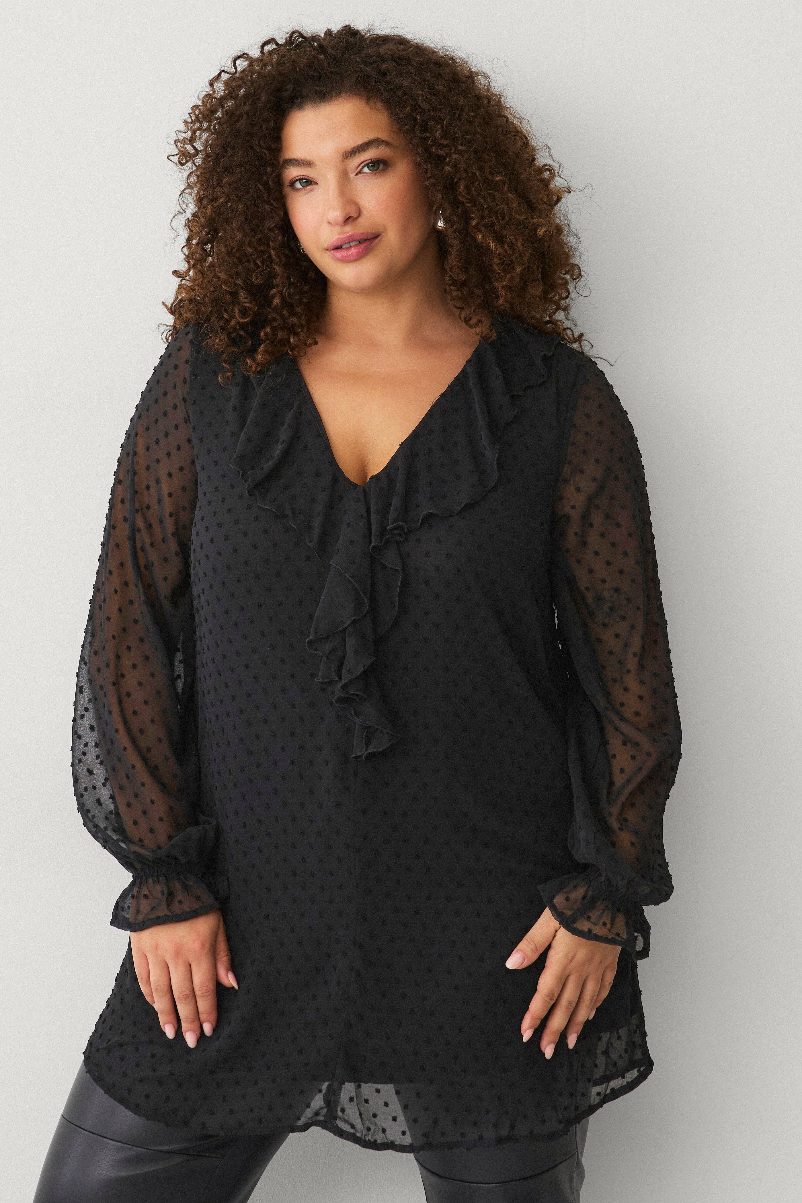 • V-formet, foret tunika med volantdetalje foran• Transparent materiale med prikket struktur• Lange, uforede ærmer• Elastik med volant ved manchetterne• Store størrelser• Længde: 86 cm i størrelse S