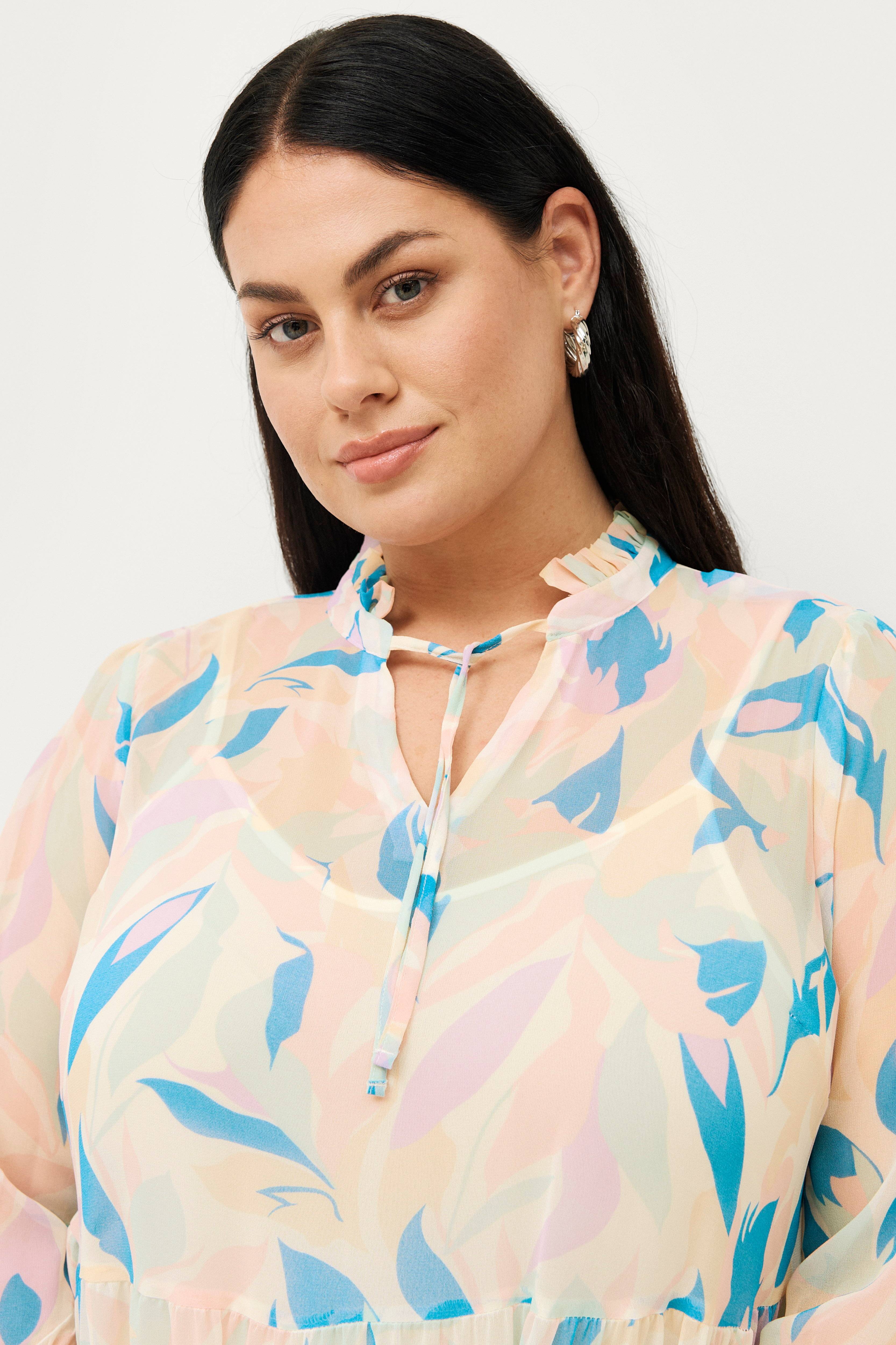 • Store størrelser • Model med svaj med volant nederst • 3/4 lange ærmer med elastiske manchetter • Ventilation med bindebånd i halsen • Fremstillet af chiffon • Underkjole i jersey • Længde: 90 cm i størrelse S