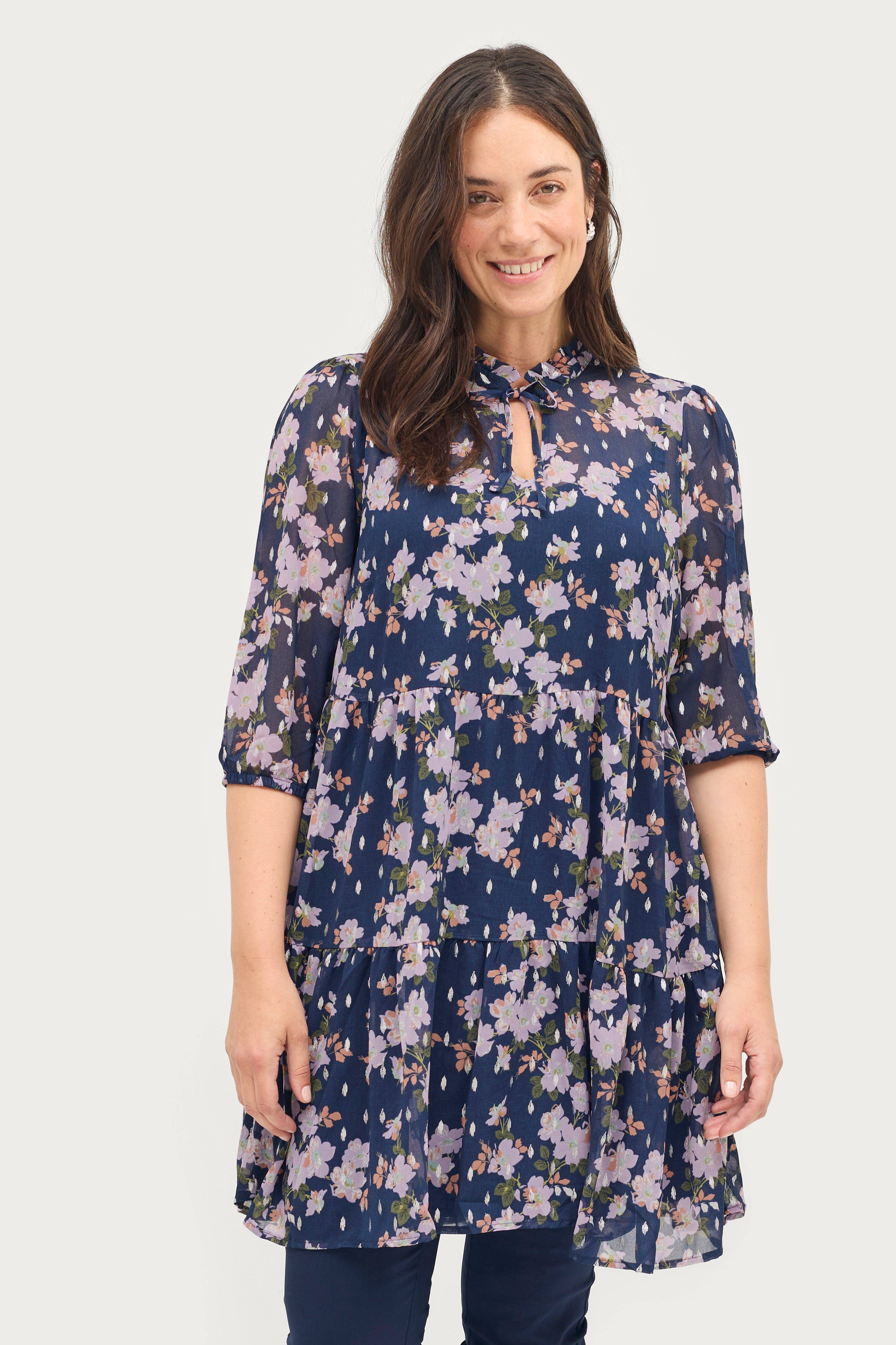 • Store størrelser • Model med svaj med volant nederst • 3/4 lange ærmer med elastiske manchetter • Ventilation med bindebånd i halsen • Fremstillet af chiffon • Underkjole i jersey • Længde: 90 cm i størrelse S