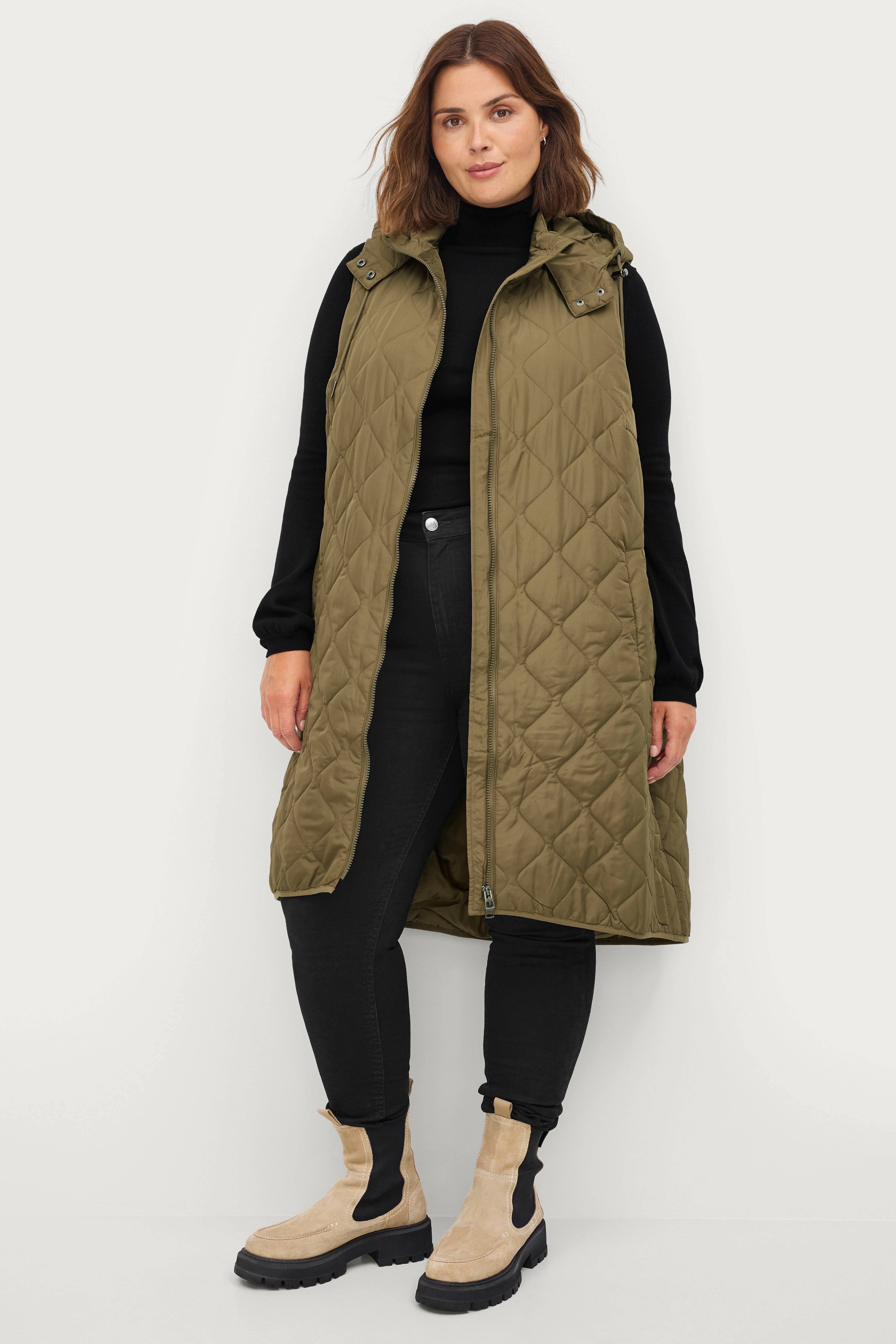 • Lang, quiltet, foret vest• Fast hætte med træksnørre• To-vejs lynlås• Store størrelser• Længde: 110 cm i størrelse S
