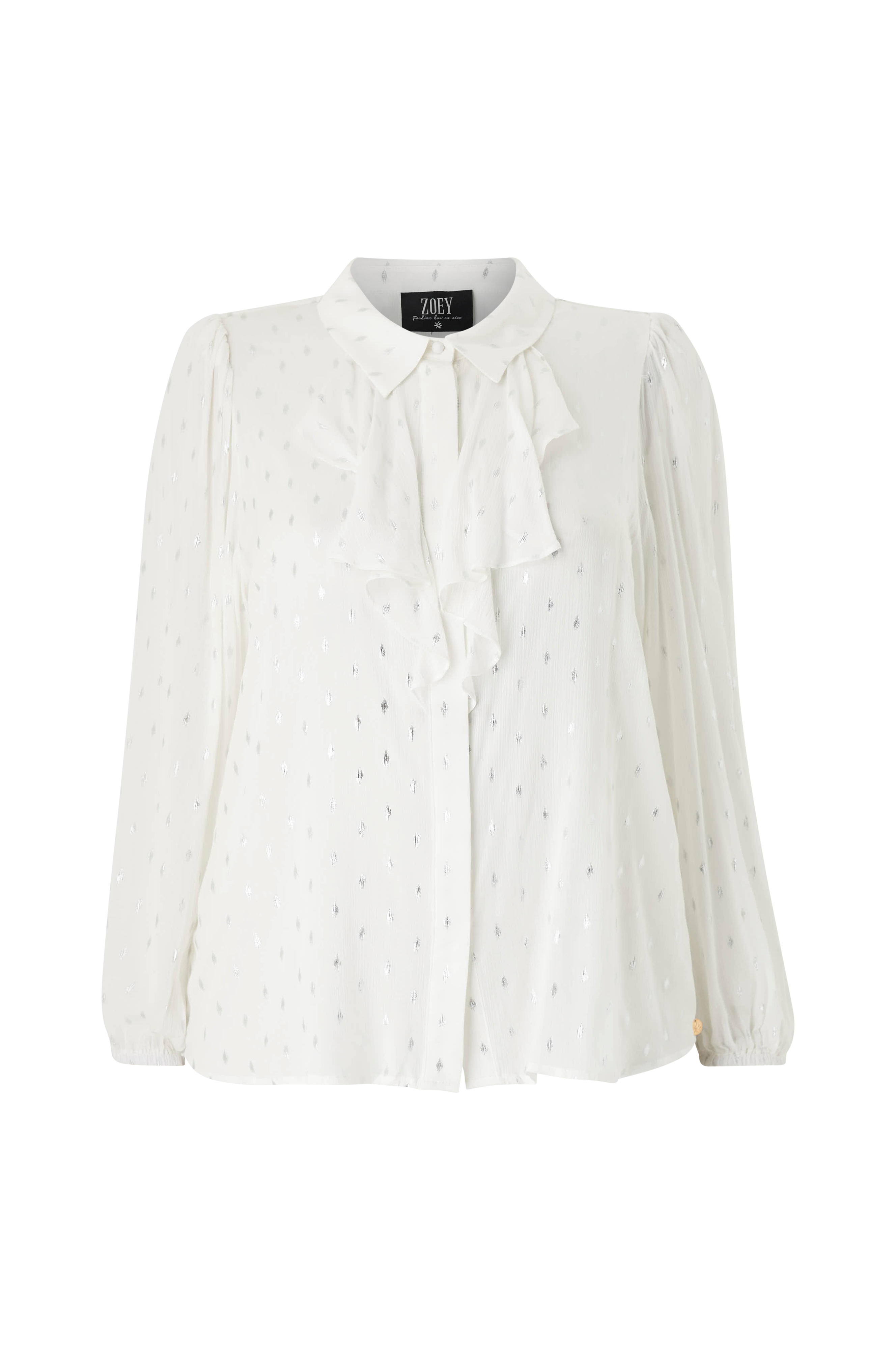 • Bluse i viskose med sølvfarvede prikker hele vejen rundt• Ballonærmer med elastik ved manchetterne• Volantdetalje oppe foran• Skjult knapstolpe• Store størrelser