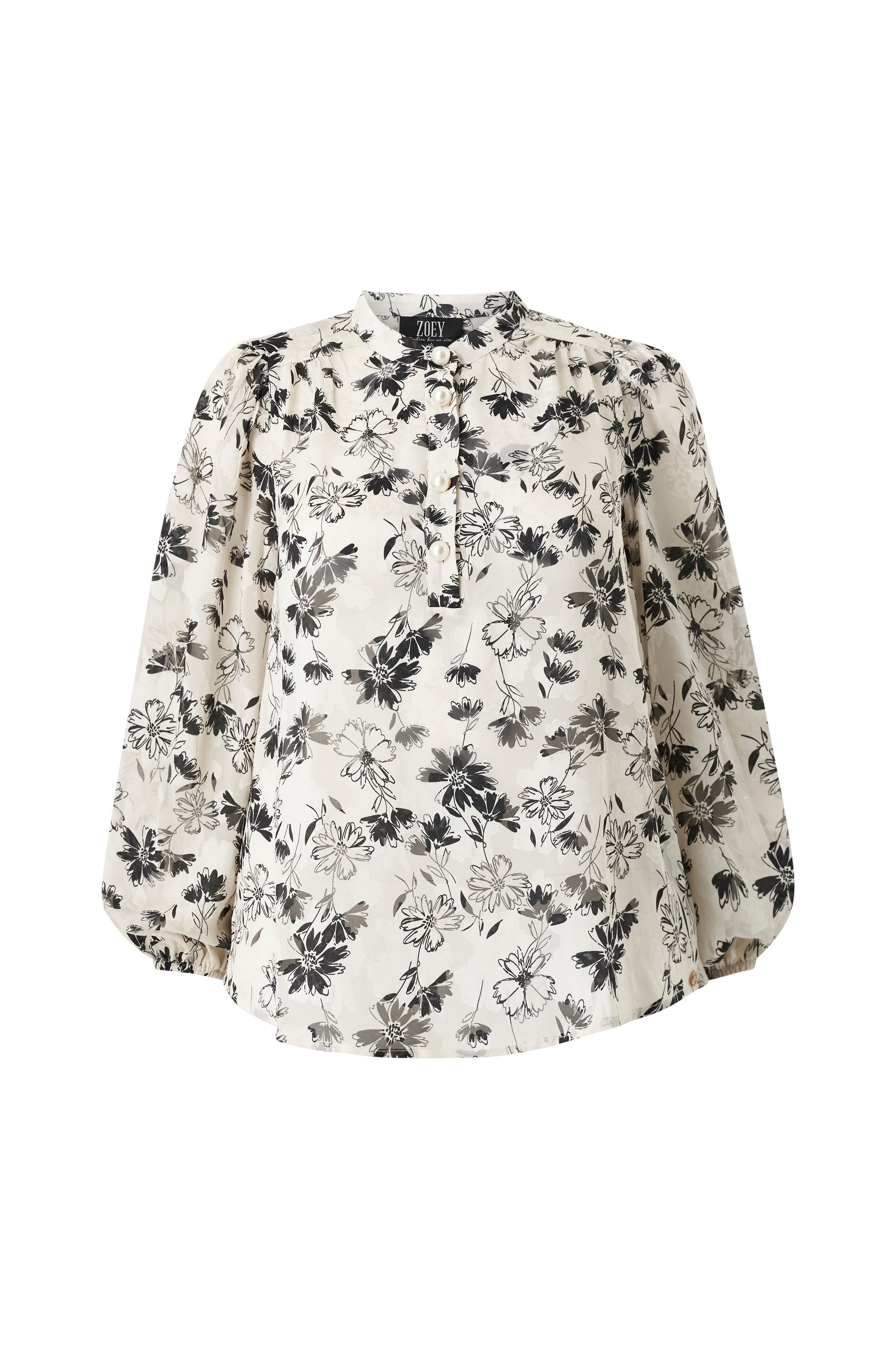 • Store størrelser• Jacquardvævet, lige model• Lille opretstående krave• Kort knaplukning foran med store perleknaper• Langt, bredt ballonærme med elastisk manchet