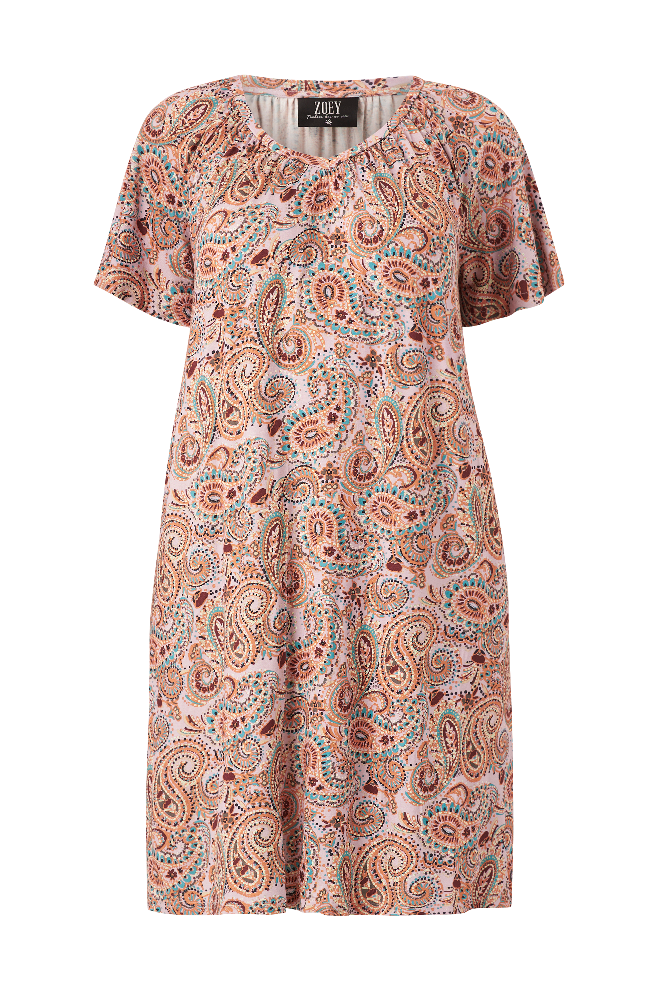 • Mønstret kjole i viskosejersey• V-udskæring• Korte ærmer• Store størrelser• Længde: 105 cm i størrelse S
