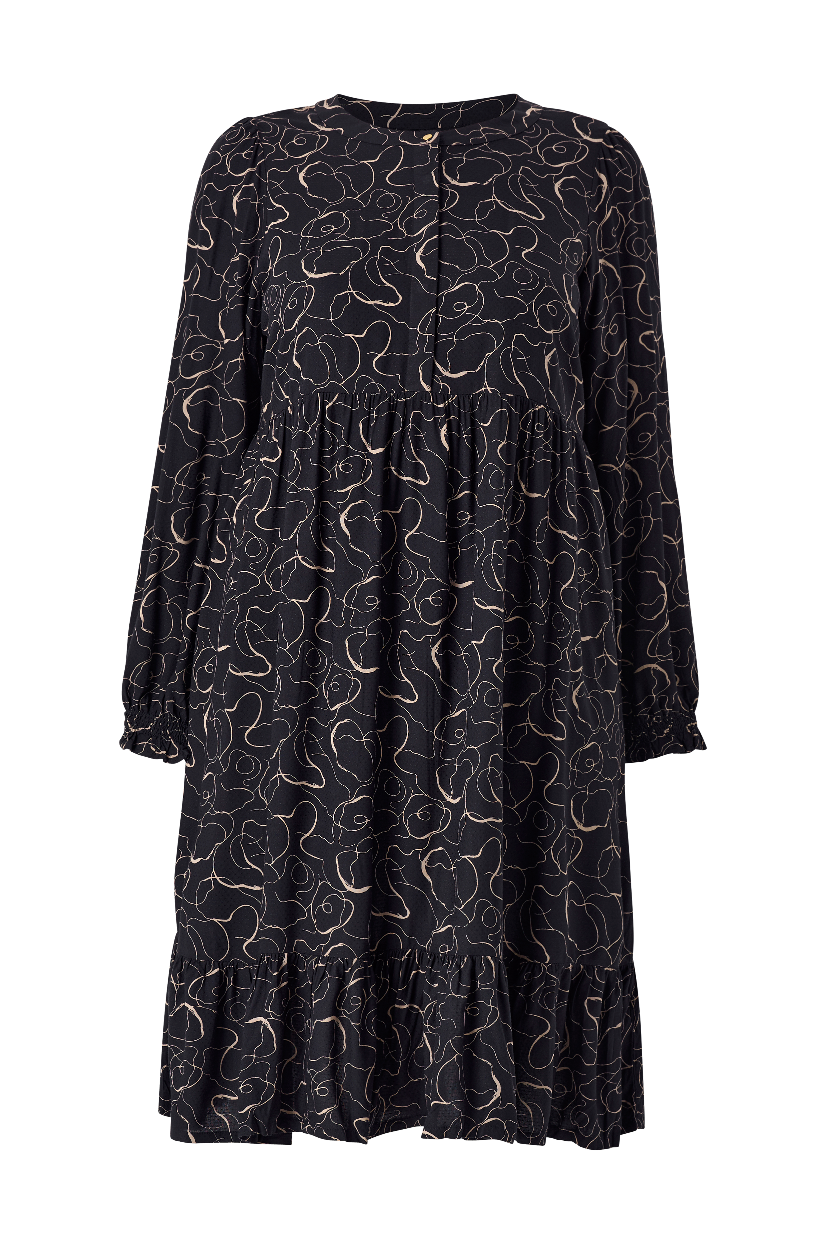 • Kjole i viskose• Skjulte knapper oppe foran• Ballonærmer med elastisk bånd ved manchetterne• Volant nederst• Store størrelser• Længde: 111 cm i størrelse S
