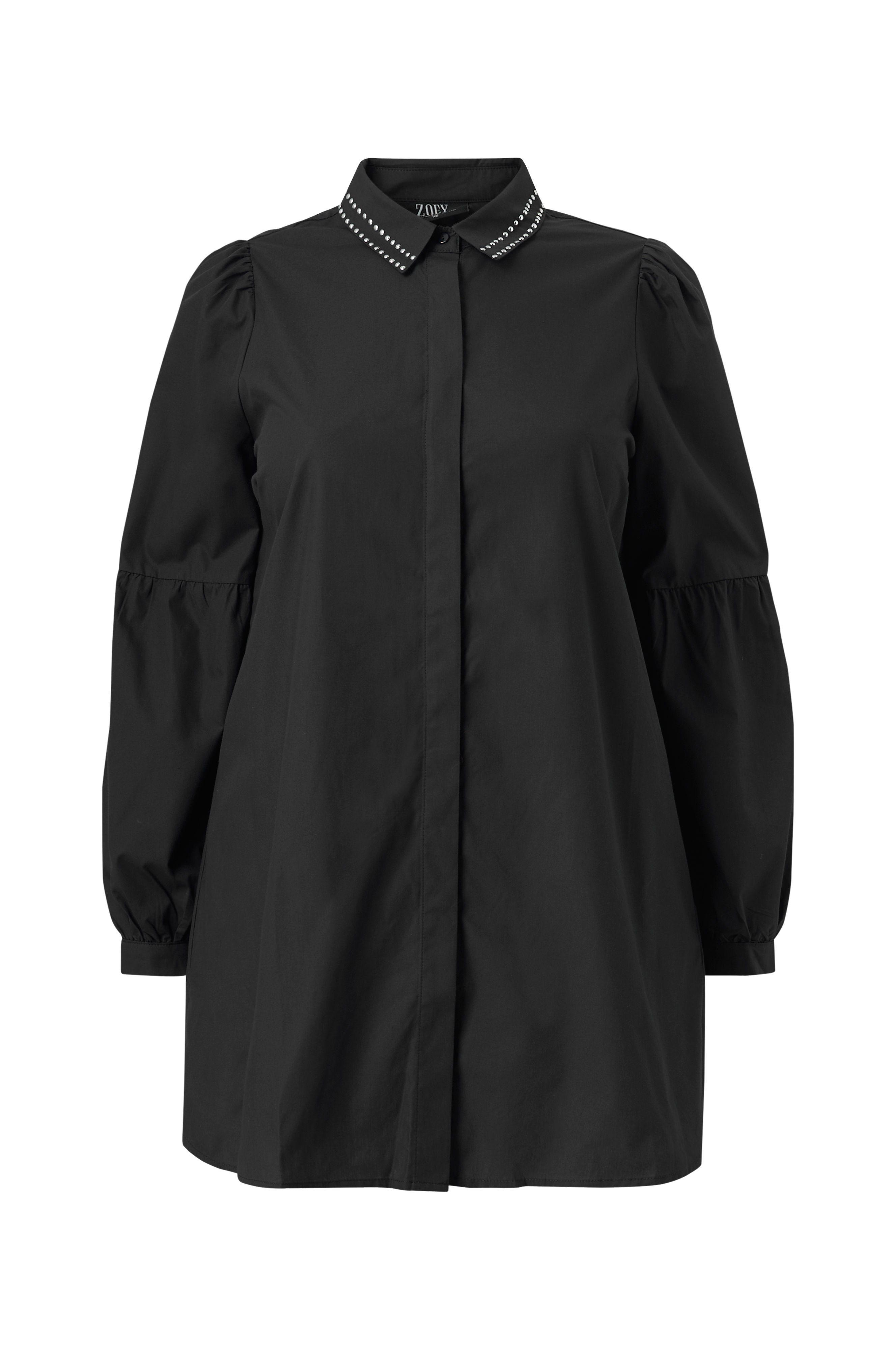 • A-linje design• Skjulte knapper foran• Dekorative nitter på kraven• Lange ballonærmer med tynd manchet• Store størrelser