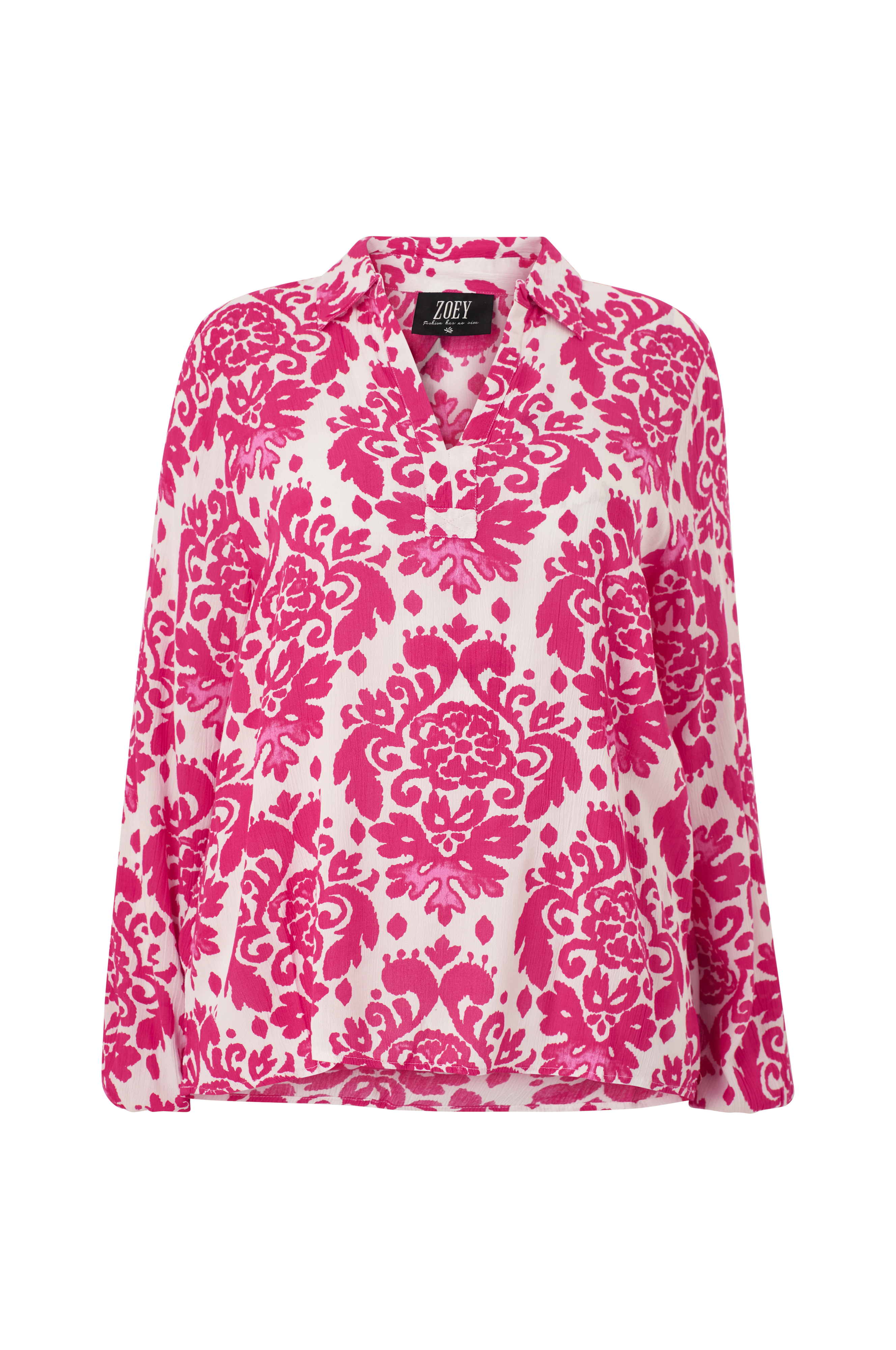 • Store størrelser• Bred, lige model i crepe• Halsudskæring med krave og ventilation foran• Langt ærme med elastik ved manchetterne