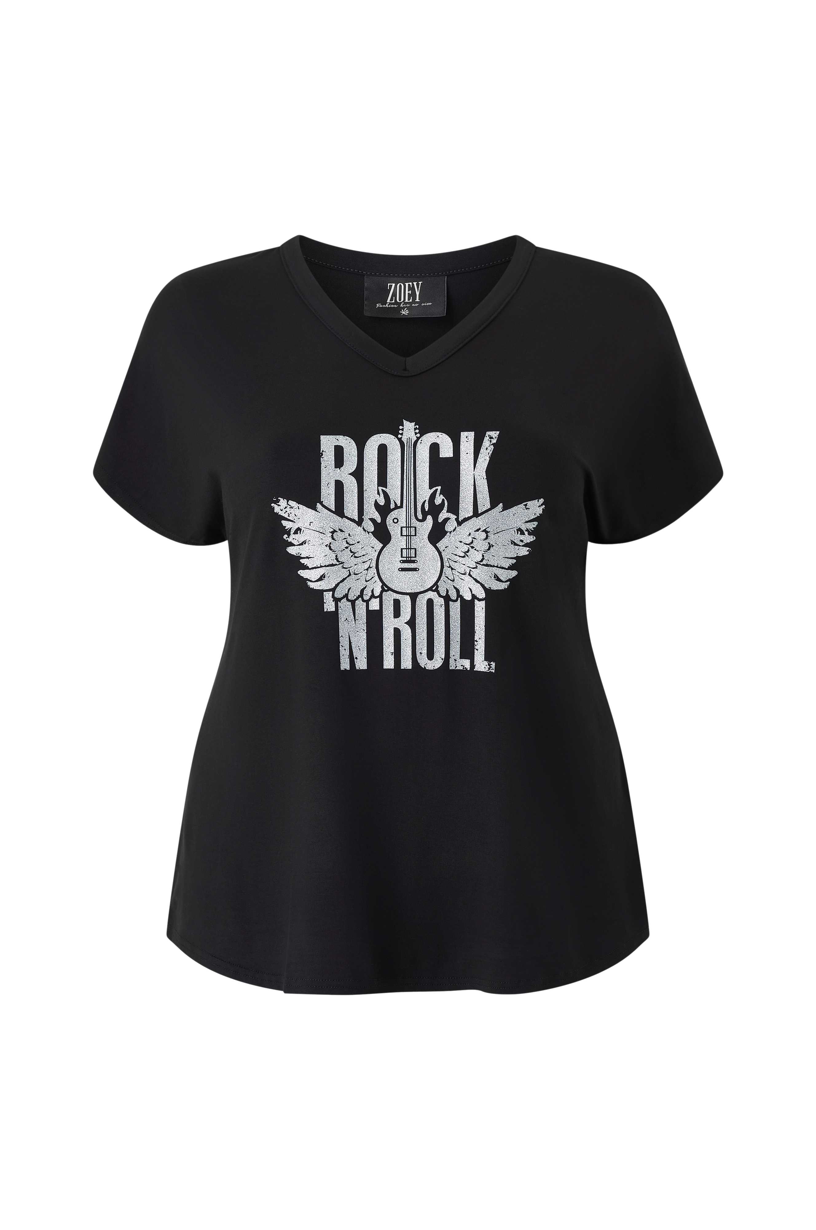 • Blød top i viskose• Stort, glitrende tryk foran• V-formet halsudskæring med påsyet kant• Korte ærmer• Plusstørrelser