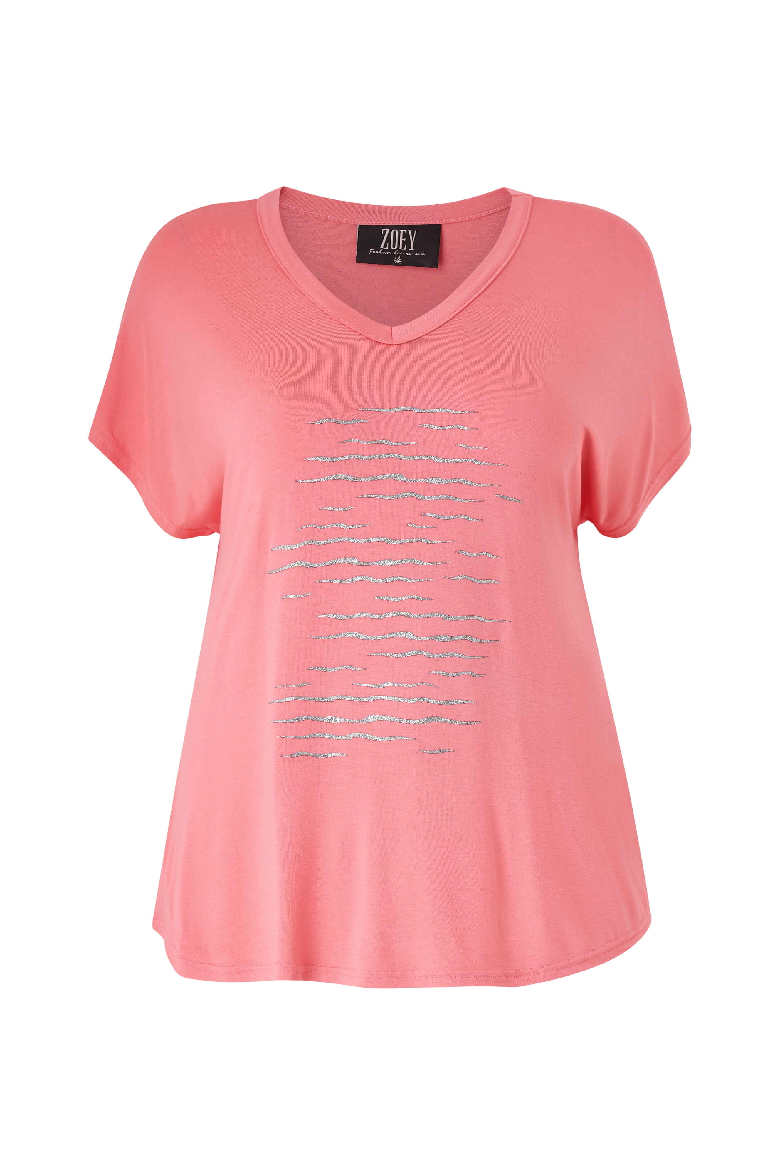 • Top i elastisk, luftigt materiale• V-formet halsudskæring• Glitrende tryk foran• Modfold oppe bagved