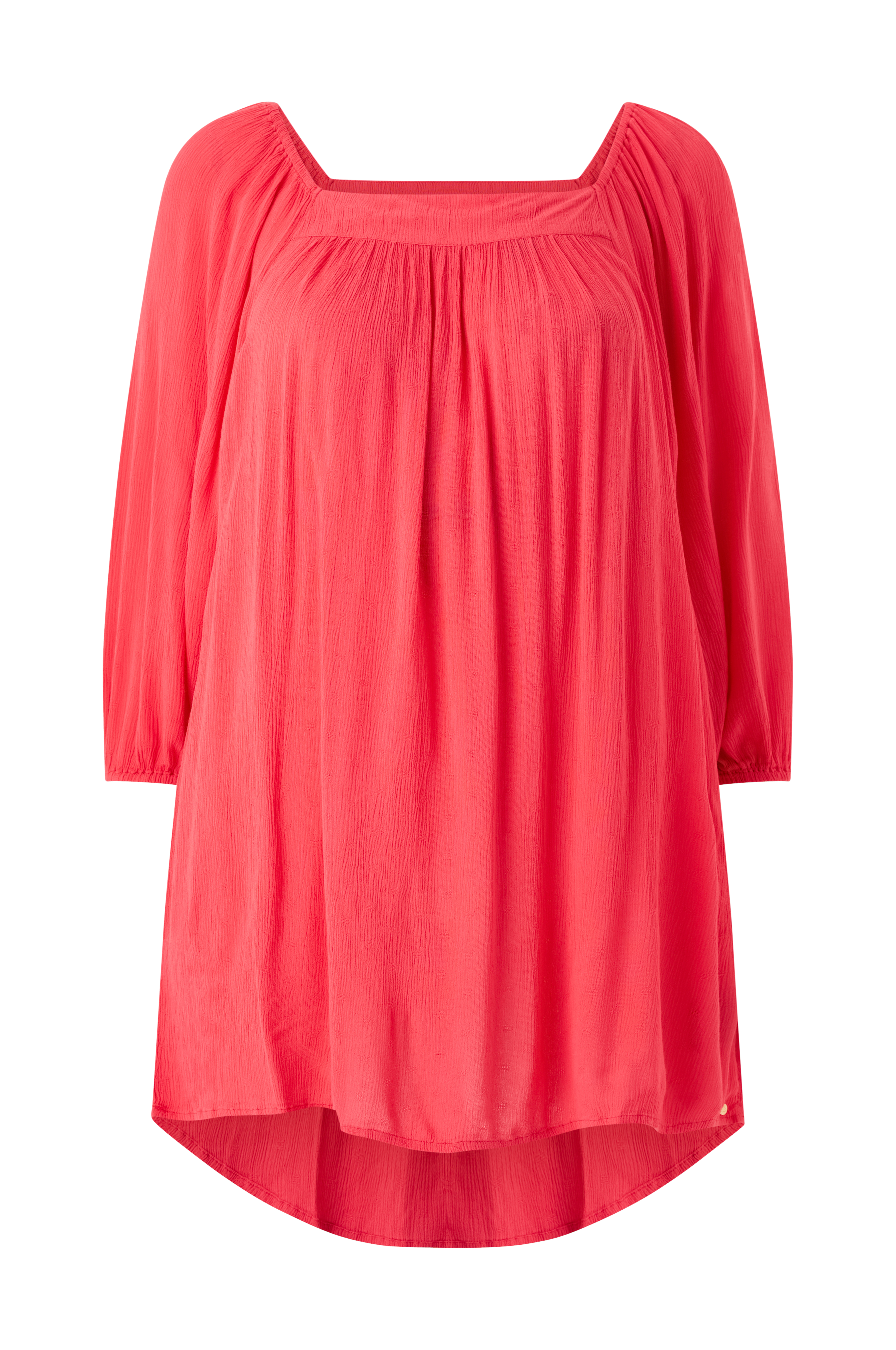 • Tunika i viskose• Firkantet halsudskæring• Lange ærmer med elastik ved manchetterne• Rynkede detaljer foran og bagpå• Afrundet søm• Store størrelser• Længde: 88 cm i størrelse S