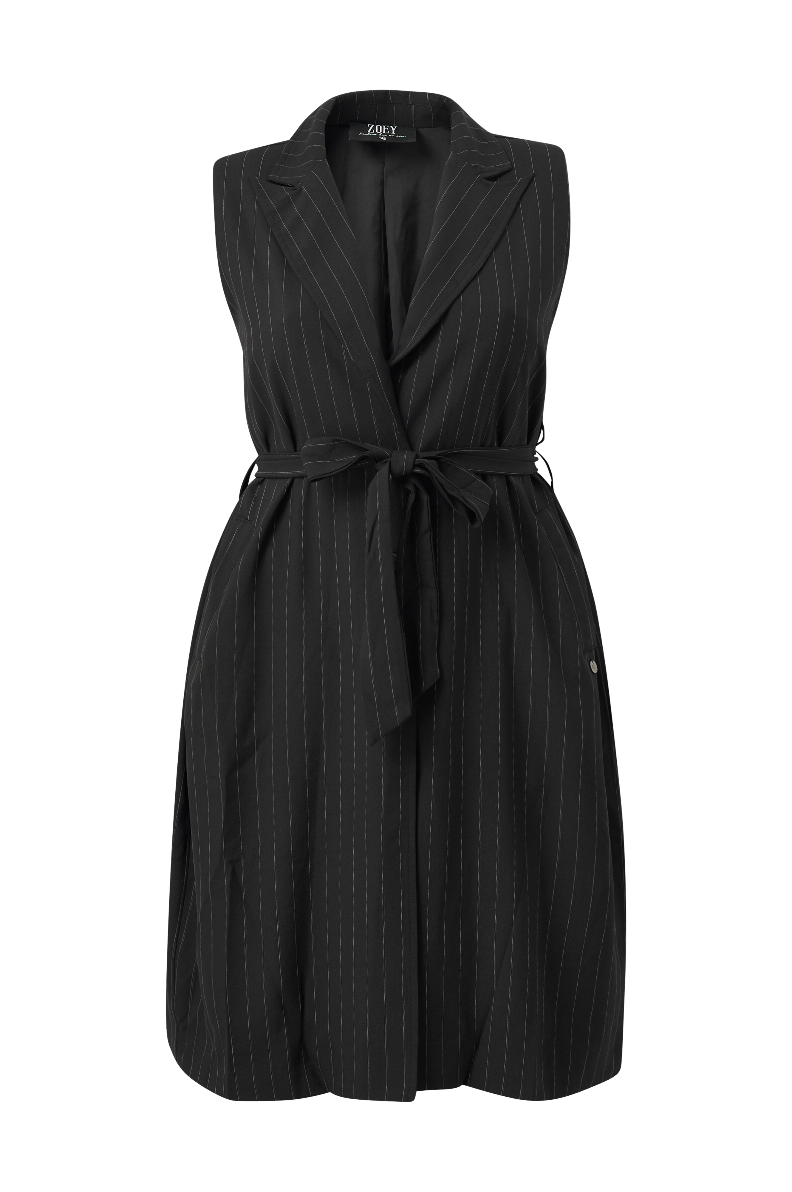 • Lang, nålestribet vest• Krave med revers• Skulderpuder• To lommer• Bindebælte ved taljen• Foret